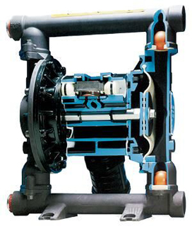 氣動雙隔膜泵采用壓縮空氣、氮氣或天然氣作為動力。主定向(氣動)控制閥將壓縮空氣分配至氣體腔室,向隔膜的內表面上施加均勻壓力。同時排出的氣體從泵另一側后方通過氣閥組件導向端口排出。
